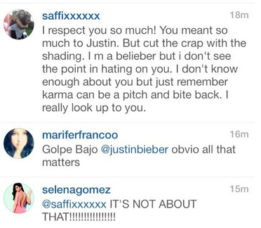 E ontem, Selena postou na rede social uma foto sem maquiagem com uma legenda (“Eu achei que ele só gostava da categoria de Latinas. Smh….#semmaquiagem #odeioquandomeninasdizemisso xx”) que levou os fãs de seu ex-namorado e a mídia pensarem que foi direcionado ao cantor Justin Bieber. Uma menina, que diz admirar a cantora, comentou na foto falando do canadense e a cantora logo respondeu que não tem nada a ver com ele. Veja abaixo: